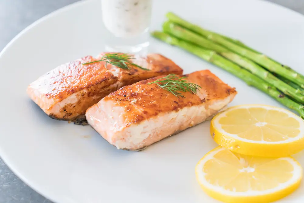 A perfectly pan-seared salmon filet featuring a tender, flaky interior and a light, caramelized finish. Dressed simply with a bright citrus zest reduction and a medley of fresh garden herbs.
